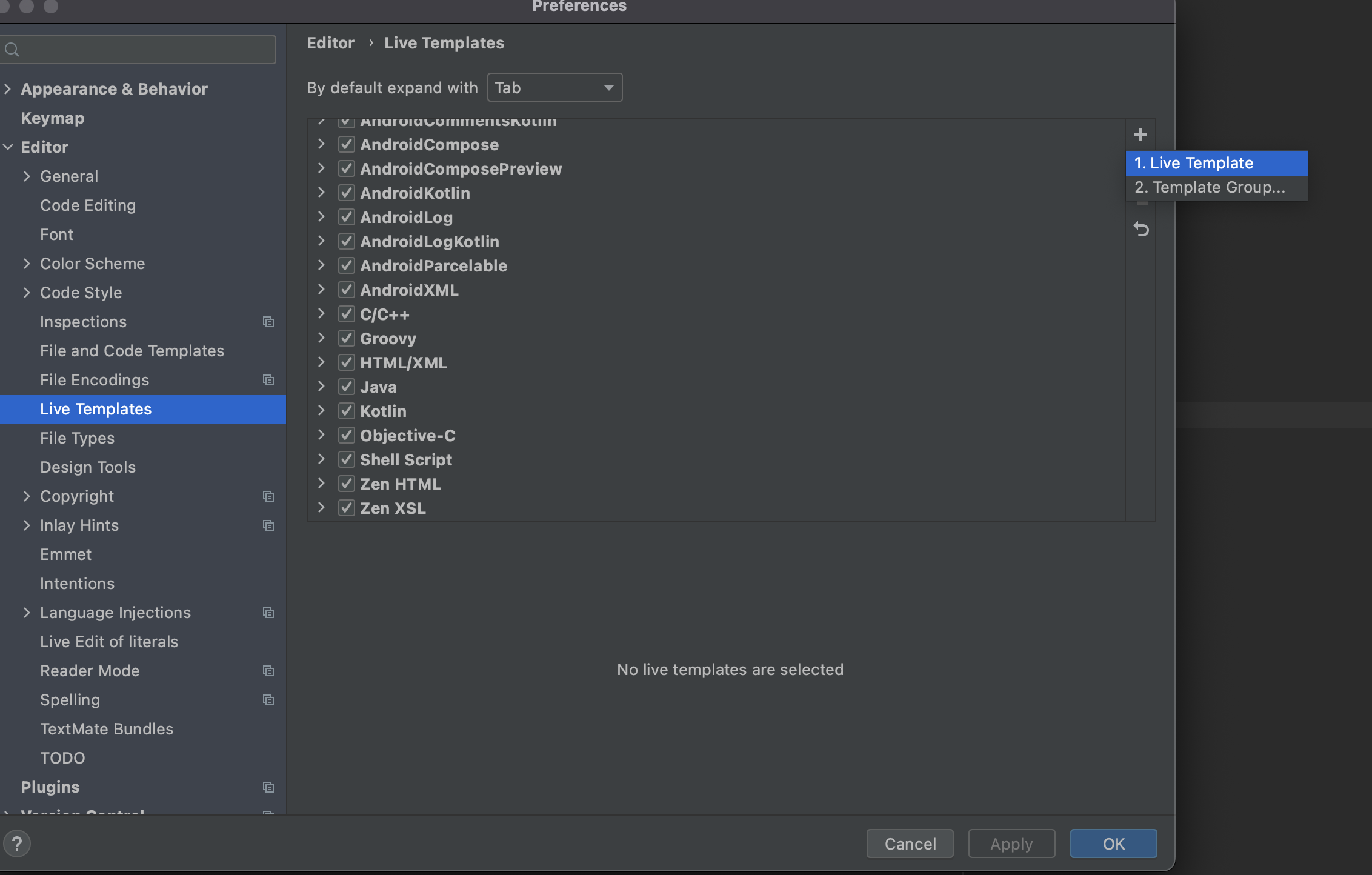 2. ์ฐ์ธก Add๋ฅผ ํด๋ฆญํ์ฌ Live Templates๋ฅผ ํด๋ฆญ ํด์ค๋๋ค.