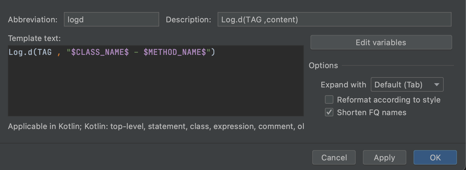 * $METHOD-NAME$ - ํ์ฌ ๋ฉ์๋๋ช ์ ๋ณ์๋ก ์๋ ฅ๋ฐ์ ์ถ๋ ฅํฉ๋๋ค.